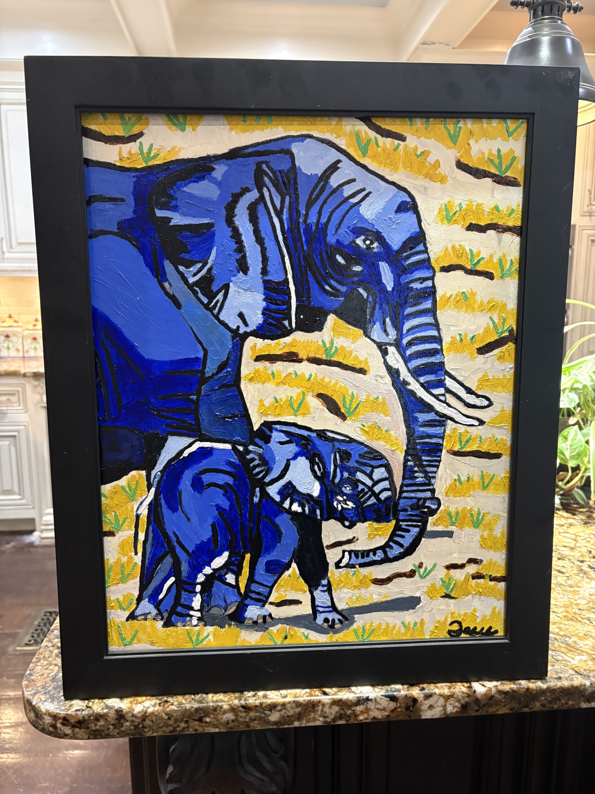Blue Elephants (painting 16” x 20,” frame 19” x 23”)